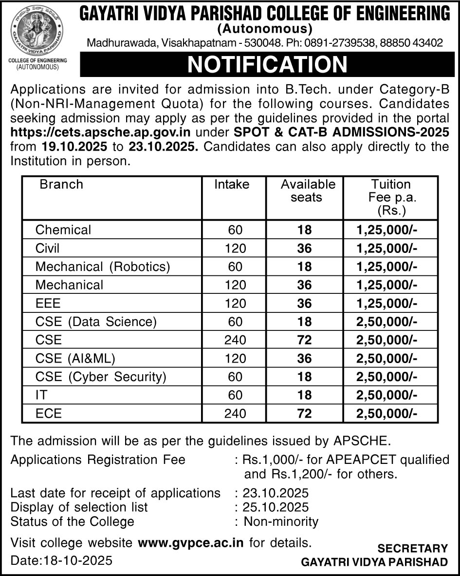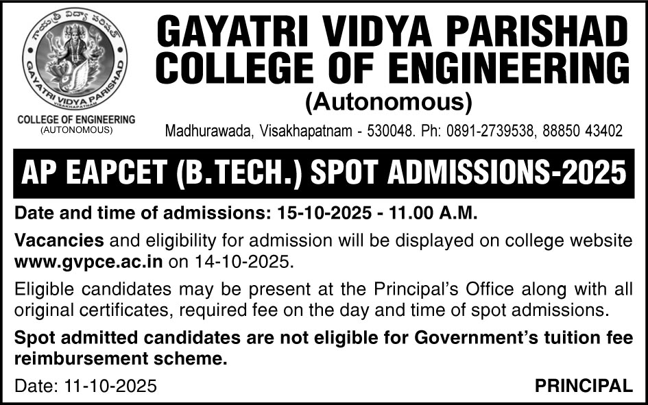 AP EAPCET (B.TECH.) SPOT ADMISSIONS - 2025