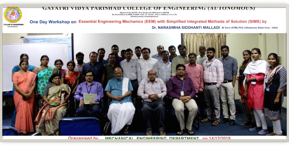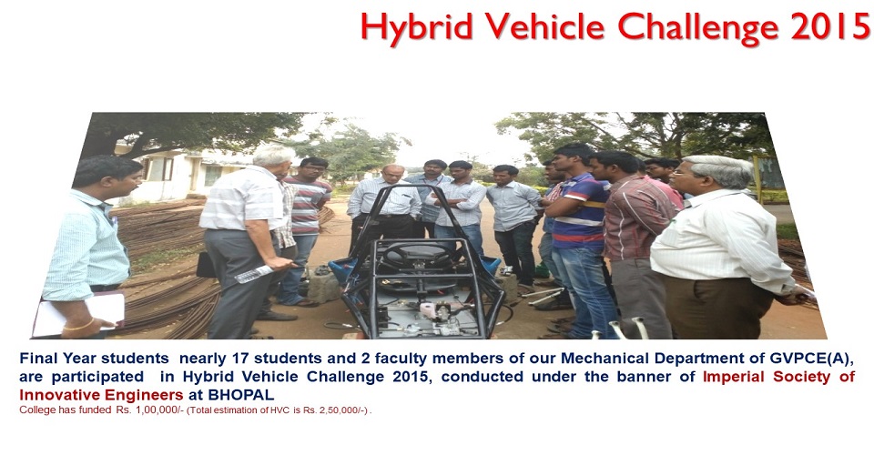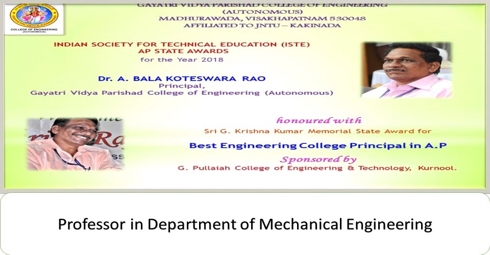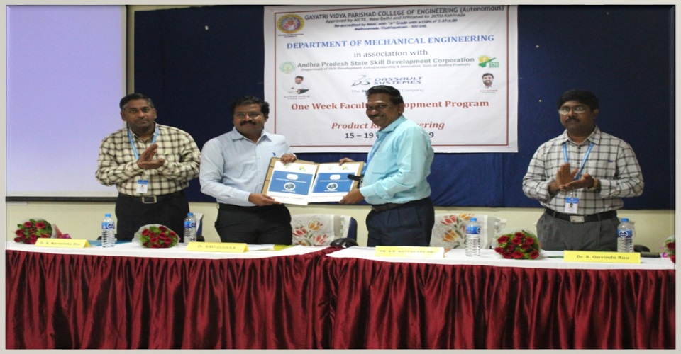 The Department of Mechanical Engineering started functioning since inception of Gayatri Vidya Parishad College of Engineering in the year 1996. The department has a team of highly qualified faculty members, many holding Ph.D`s from the elite institutes like IIT's and NIT's and universities abroad. The pride of the department lies in receiving 40 research and consultancy projects worth Rs. 2.2 Crores as research funding from several Government agencies such as DST, DRDO, UGC, AICTE etc. Modern facilities, like 6-axis and 4 axis industrial robots, Parallel Kinematic machines and, Delta Robot 3D printing machine, Coordinate Measuring Machine (CMM) with CAM2 smart inspect pro, Ultrasonic plastic and metal welding machine enabling cutting edge research in a wide spectrum of technological areas are available in the department. The department has a robotics lab established with a combined funding from the Department of Science and Technology, Govt. of India under FIST scheme in 2016. The department also have Memoranda of Understanding (MoUs) with various Industry Research Organizations and four patents have been granted for the innovations in the department.