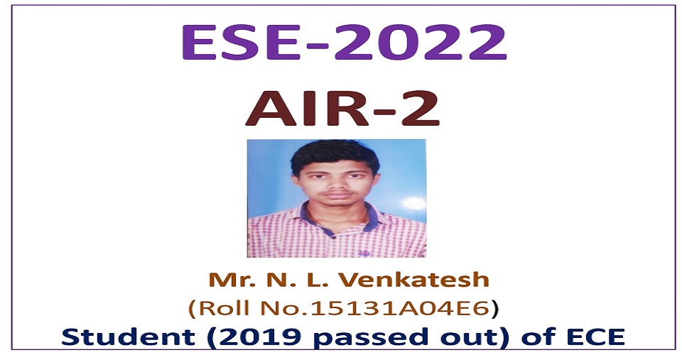 N. L. Venkatesh (Roll No.15131A04E6) student of ECE secured AIR-2 in Engineering Services Examination (ESE) - 2022.