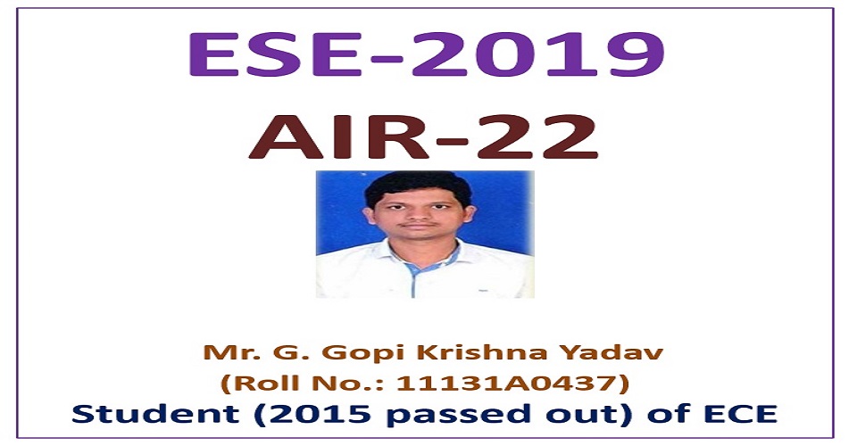 Gopi Krishna Yadav (Roll No.11131A0437) student of ECE secured AIR-22 in Engineering Services Examination (ESE) - 2019.