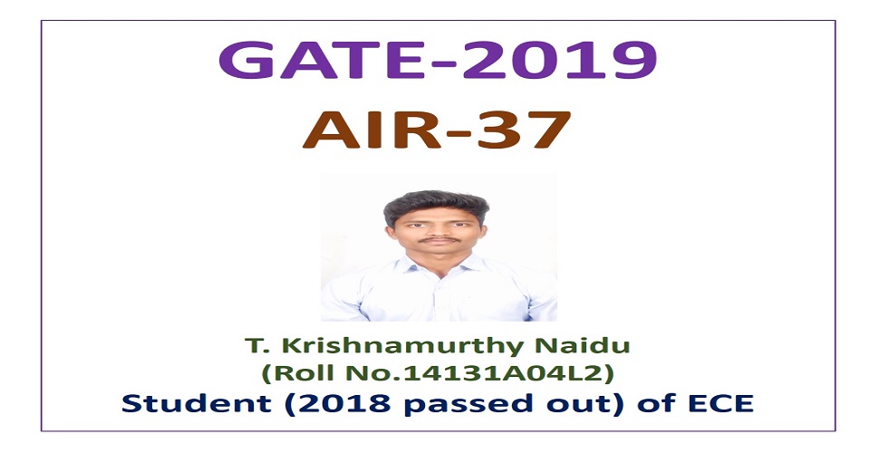 T. Krishnamurthy Naidu (Roll No.14131A04L2) student of ECEsecured AIR-37 in GATE-2019.