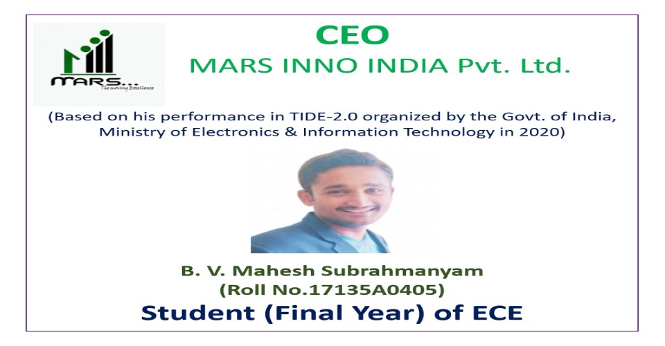 B.V.Mahesh Subrahmanyam (Roll No.17135A0405)student of ECE was selected as CEOsof MARS INNO INDIA Pvt. Ltd. (Based on his performance in TIDE-2.0 organized by the Govt. of India, Ministry of Electronics & Information Technology in 2020.